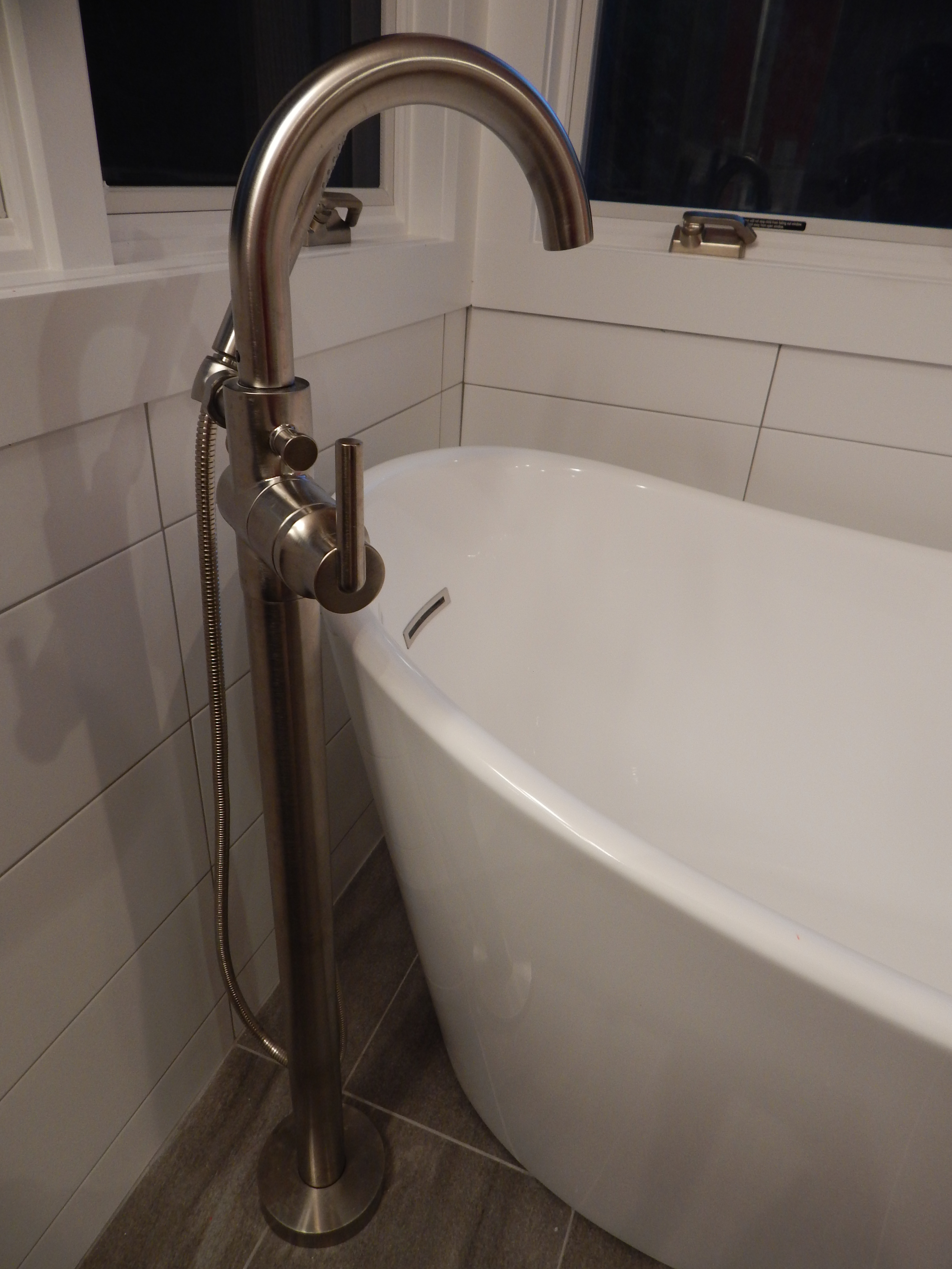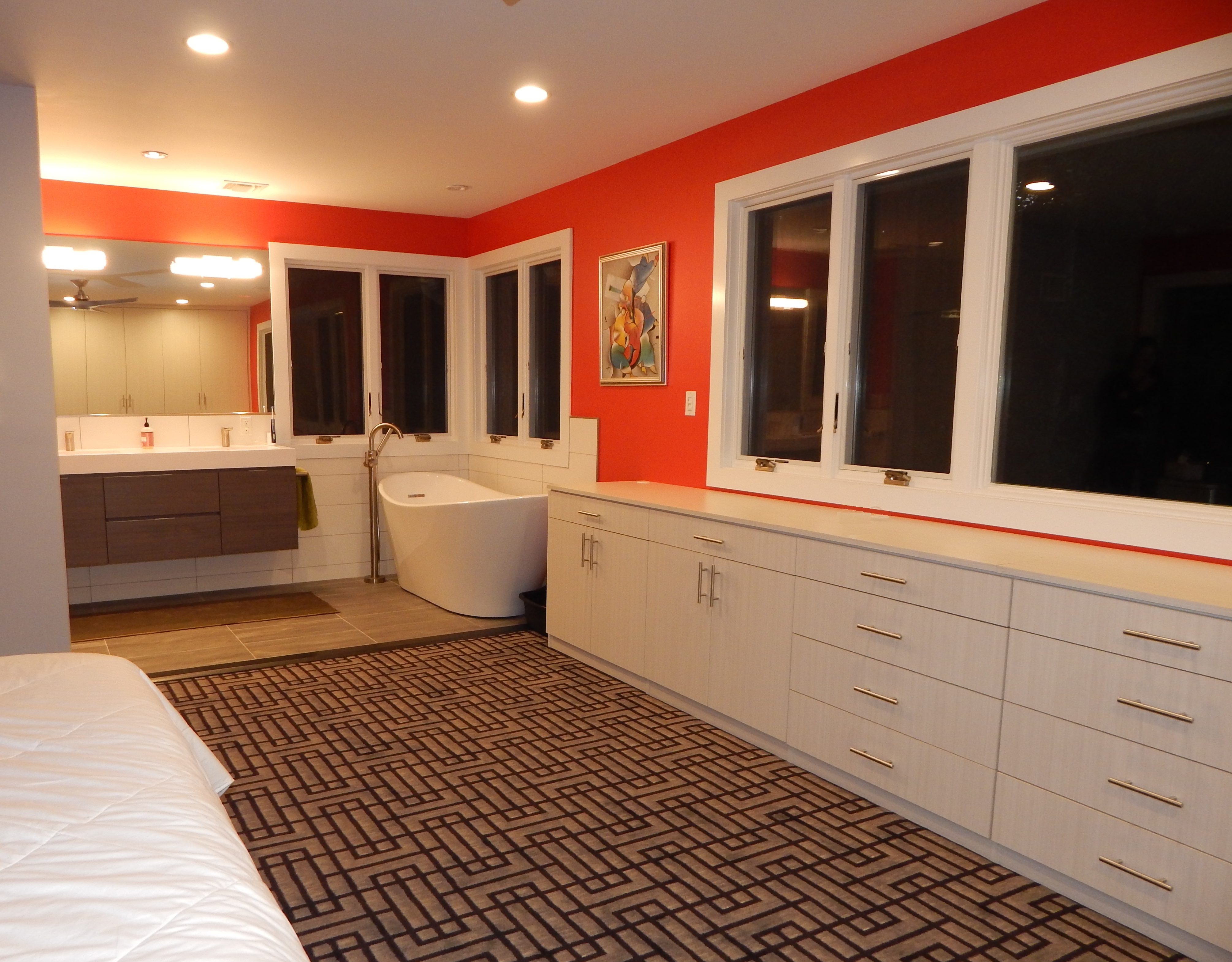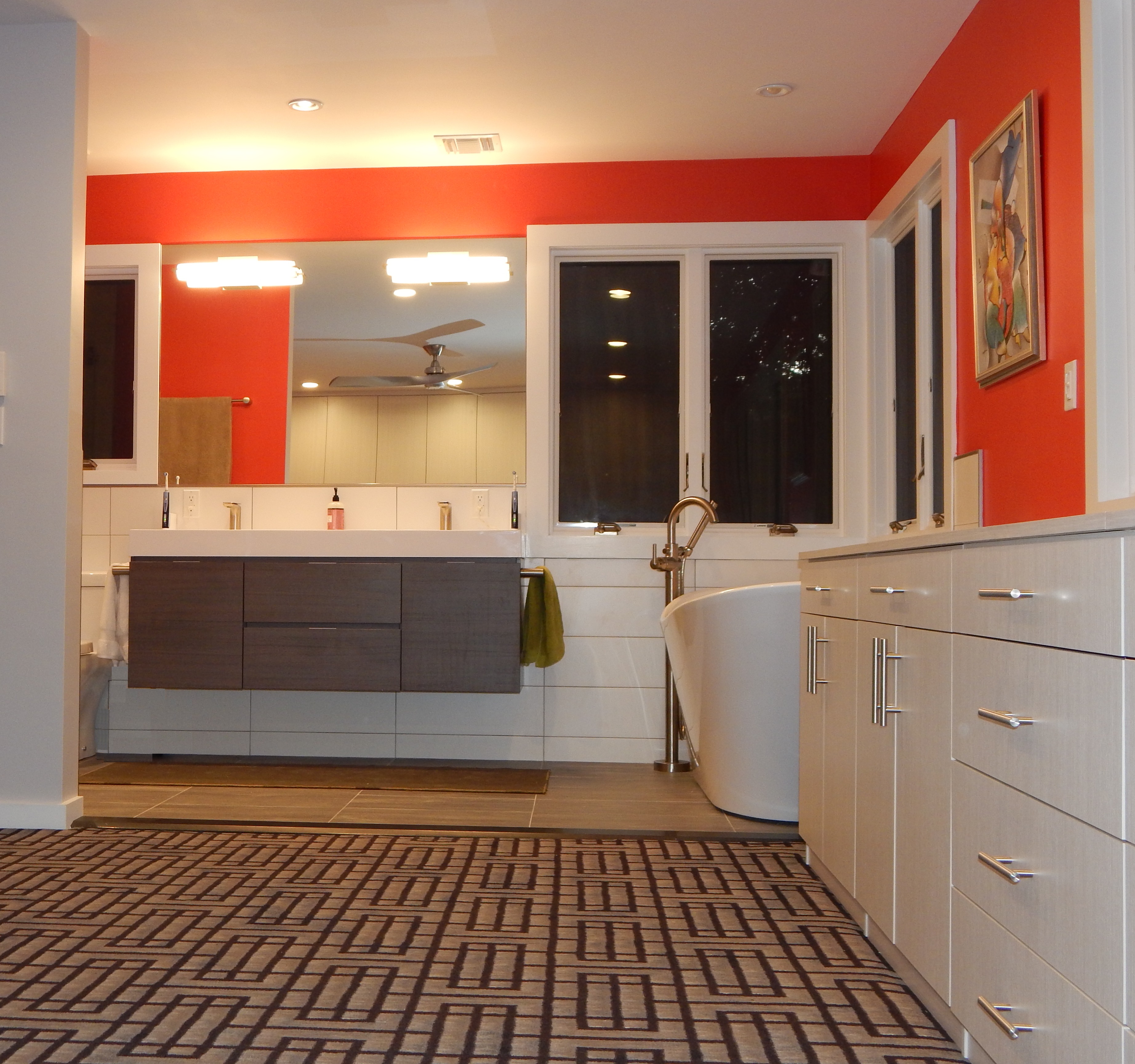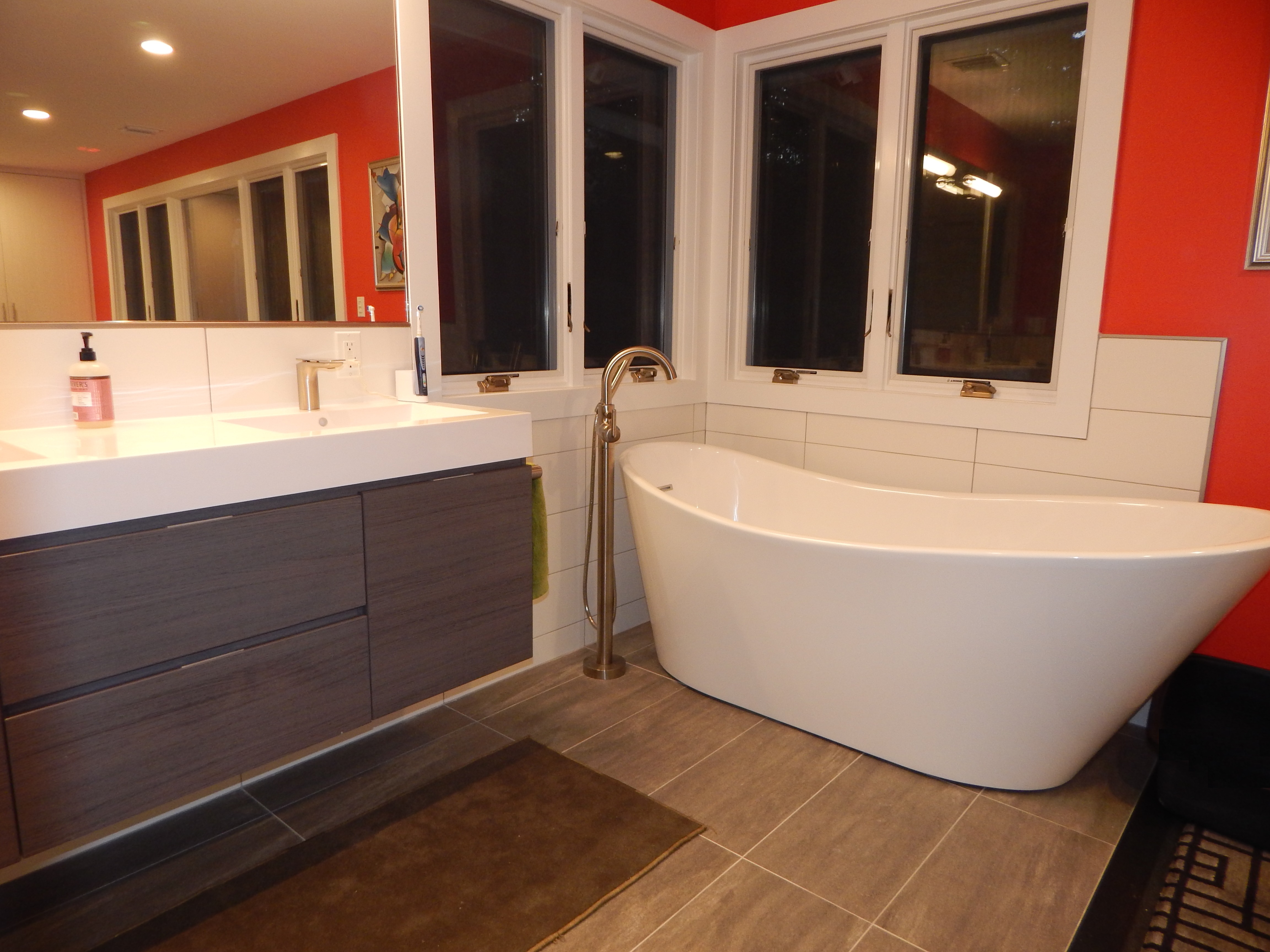 The Moen towel bars and accessories are consistent throughout all three bathrooms in the house. A Delta floor-mounted tub filler stands next to the elegant freestanding bathtub. The homeowners chose an Icera toilet as well as a floating double vanity with Graff lavatory faucets and Graff shower fixtures, further adding to the modern feel. The large white tile and red wall accent animates the room, making it a truly bold and unique work of art.