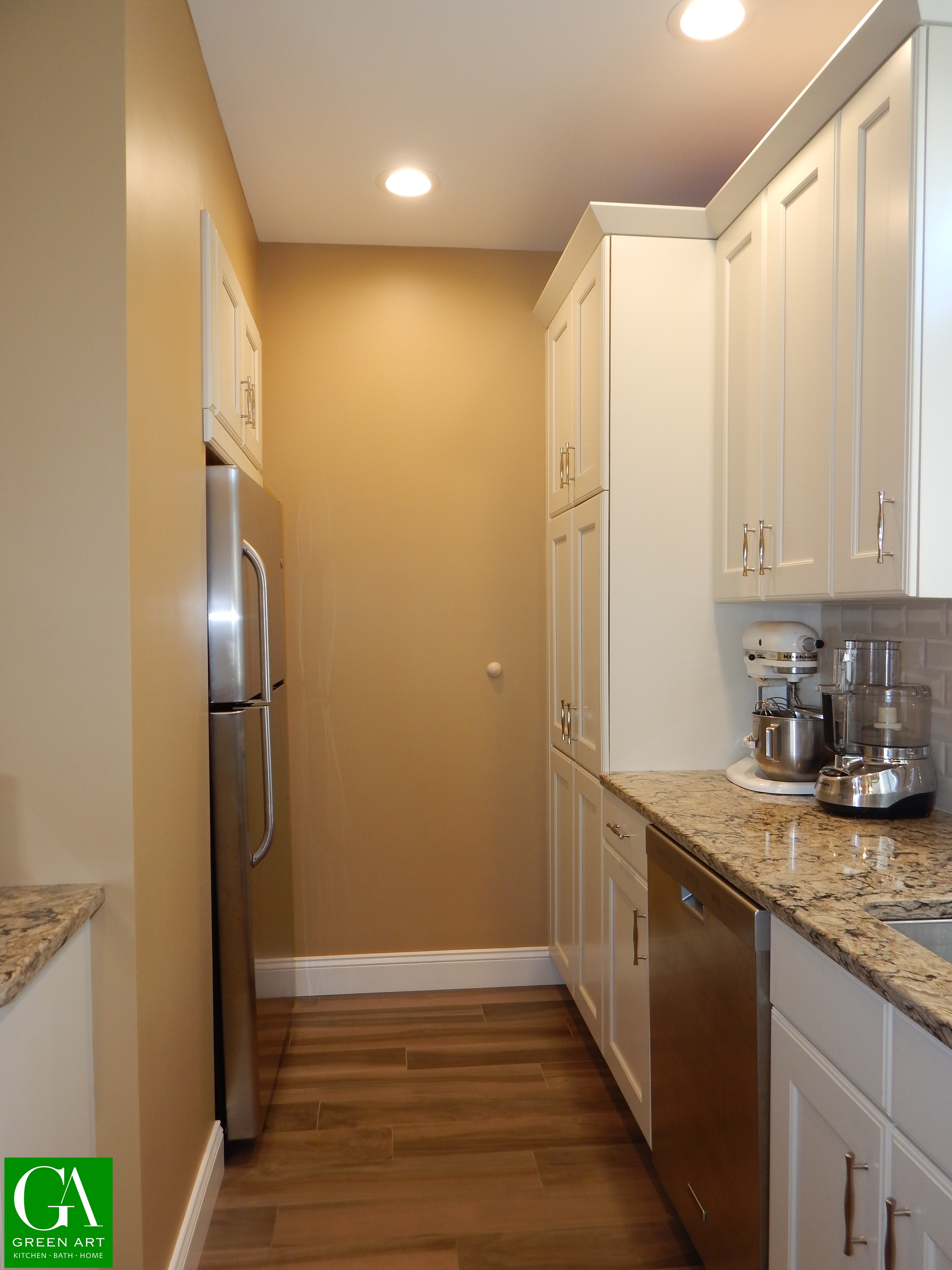 Kathy fell in love with her new bathroom, so much so that she went back to Green Art and worked with Terri, a professional kitchen designer, to update her kitchen. Her cabinets are KitchenCraft in the Berkeley style with a Seashell finish. The under-mounted Kohler sink sits below Cambria countertops and a Delta faucet. A built-in slide-out microwave oven offers convenience and a touch of modern innovation. The breakfast bar opens up the space which allows Kathy to entertain guests while she prepares a meal. It also adds more natural light from the backyard. Kathy refurbished her gorgeous Wolf oven, which provides a cooktop of six burners – a dream for any chef.