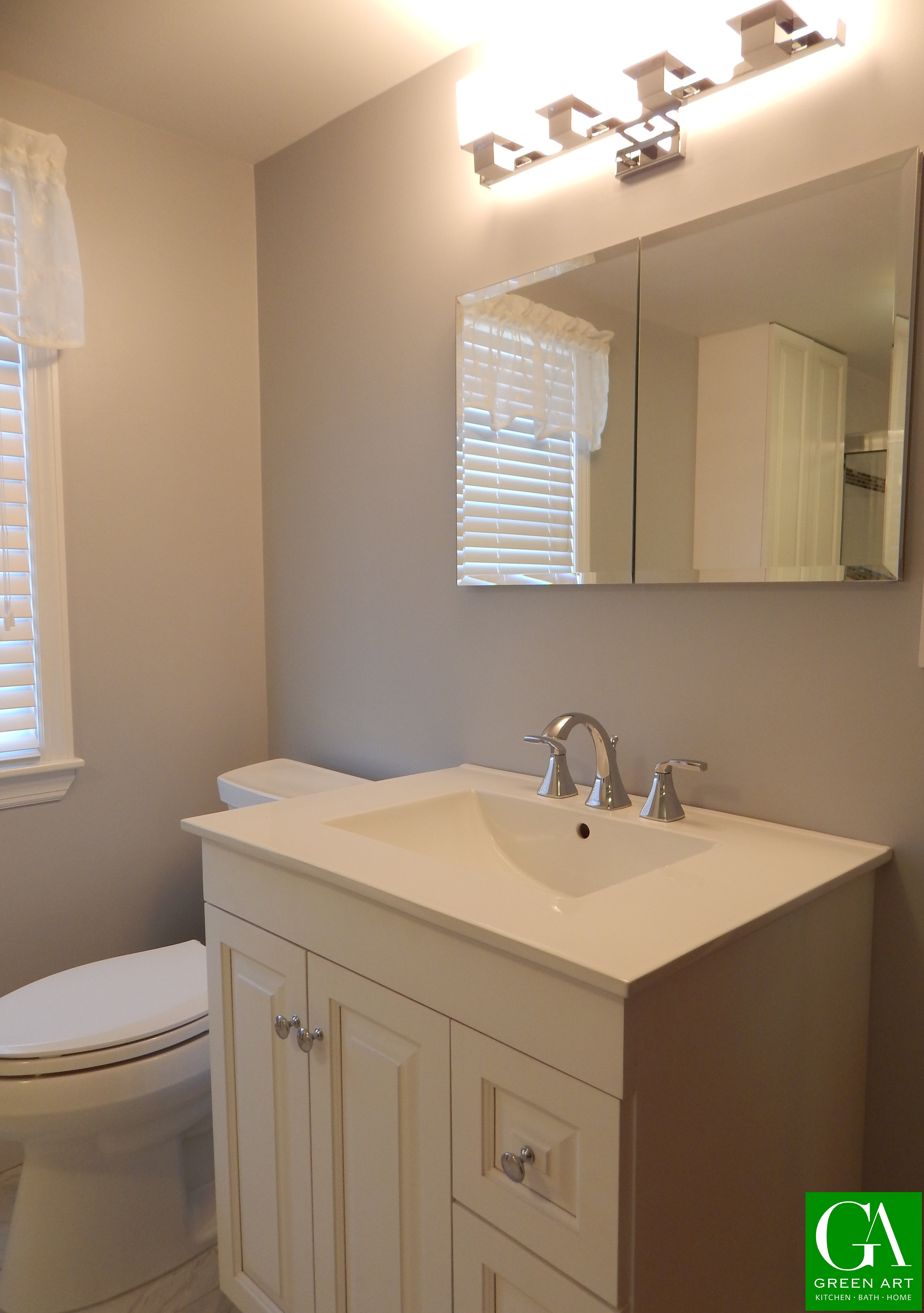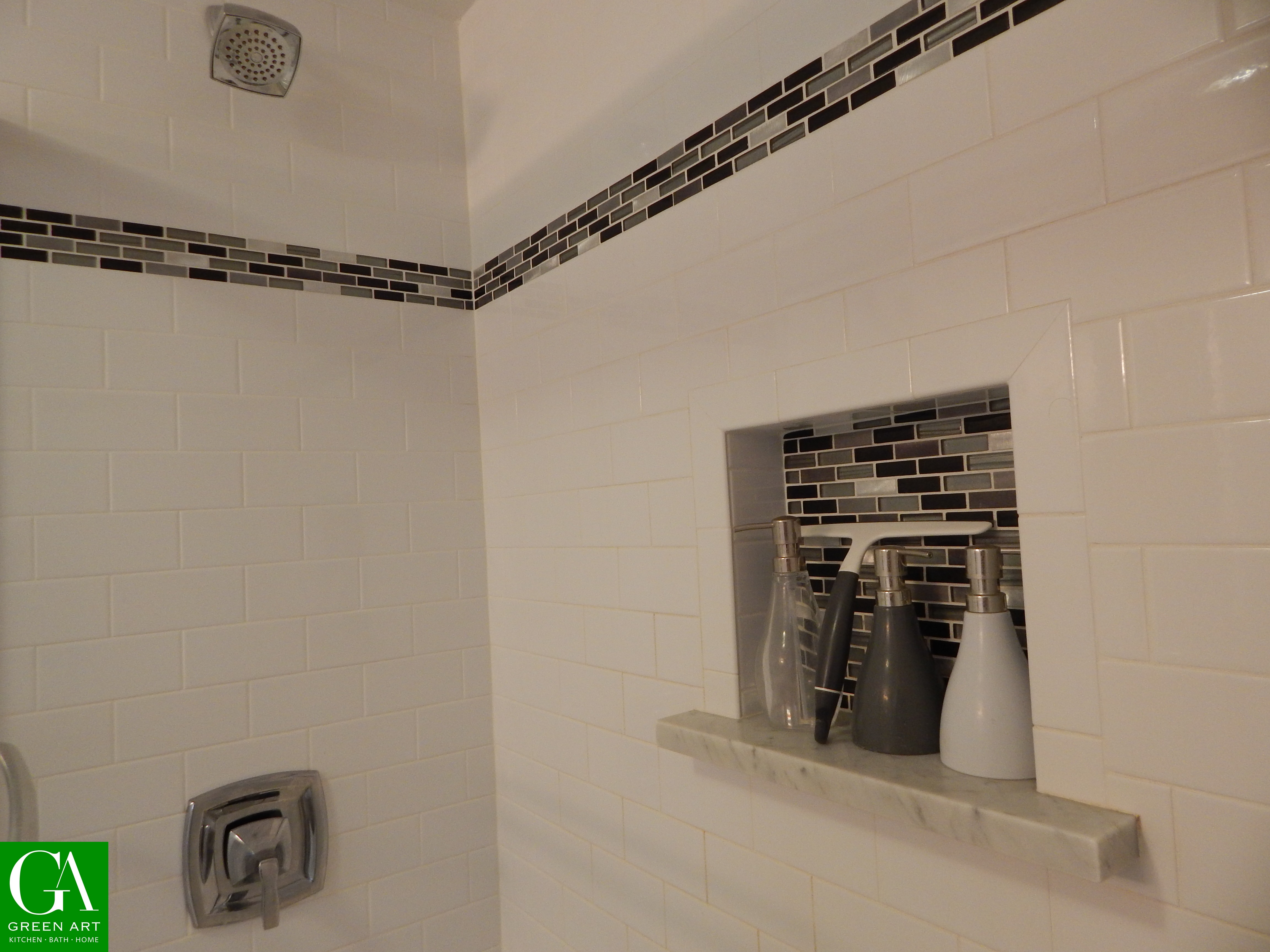 Kathy of Valley Stream, NY was shopping for bathroom fixtures at her local Home Depot when she noticed a plumbing supply across the parking lot. Curious about what she would find, Kathy walked into the Green Art showroom and spoke with Igor about remodeling her bathroom. They chose a vanity and tall storage cabinet from New York Vanity, a Fairmont sink top, a Sofia medicine cabinet, a Kohler Wellworth comfort-height toilet, a chrome Voss faucet from Moen, and matching showerhead and PosiTemp® valve which helps to maintain the water temperature. A sleek frameless Kohler shower door showcases the elegant black, white, and gray tile used around the tub and within the recessed shelf. Igor also helped Kathy with the design of the room to appease both functionality and aesthetics.
