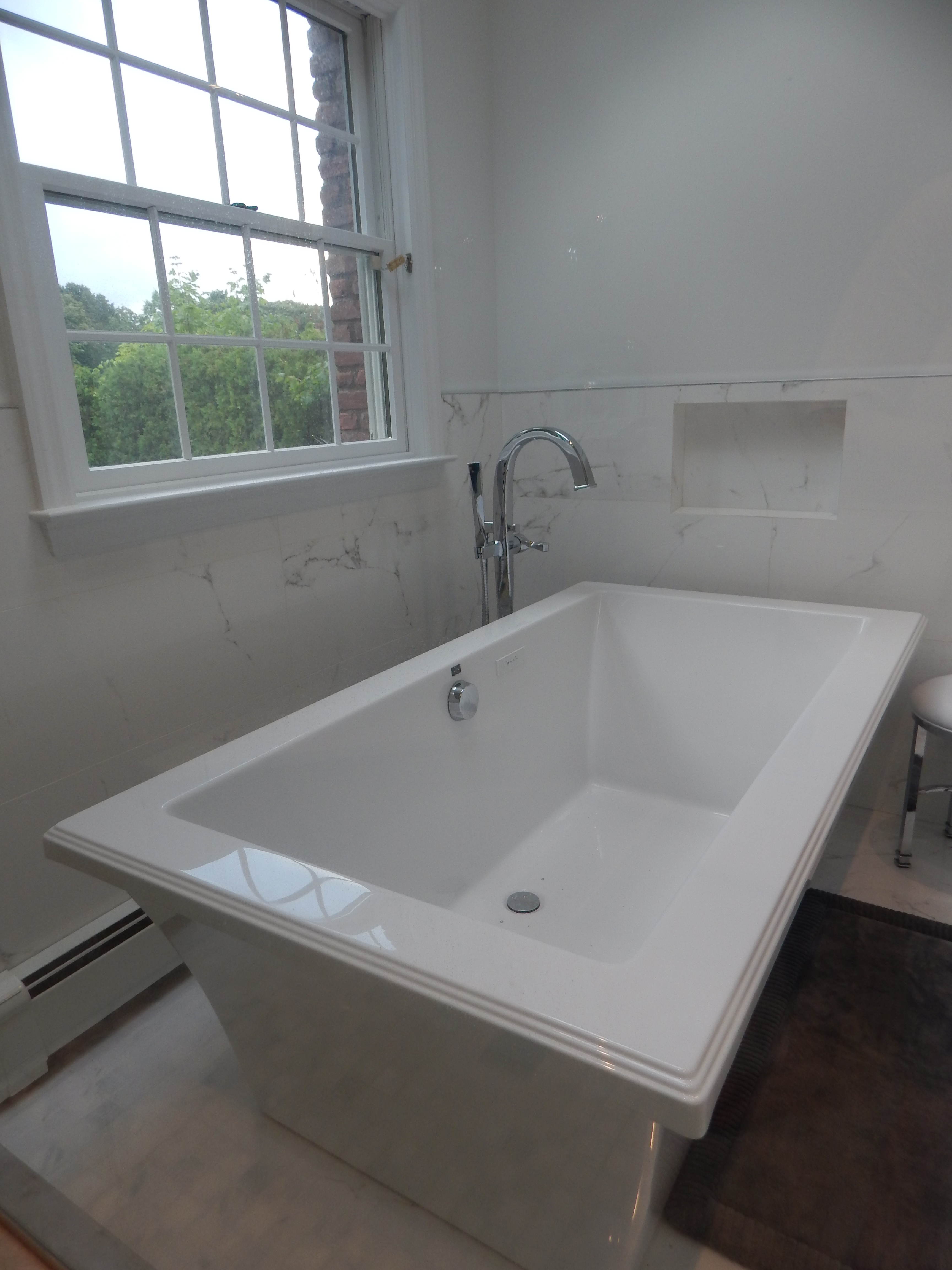 These homeowners wanted a master bathroom with clean lines and a contemporary feel. They chose to go with a luxurious large walk-in shower and separate freestanding MTI Baths tub – a very popular choice for those that have the space. You can explore many fixture choices at one of Green Art’s LI showrooms.
