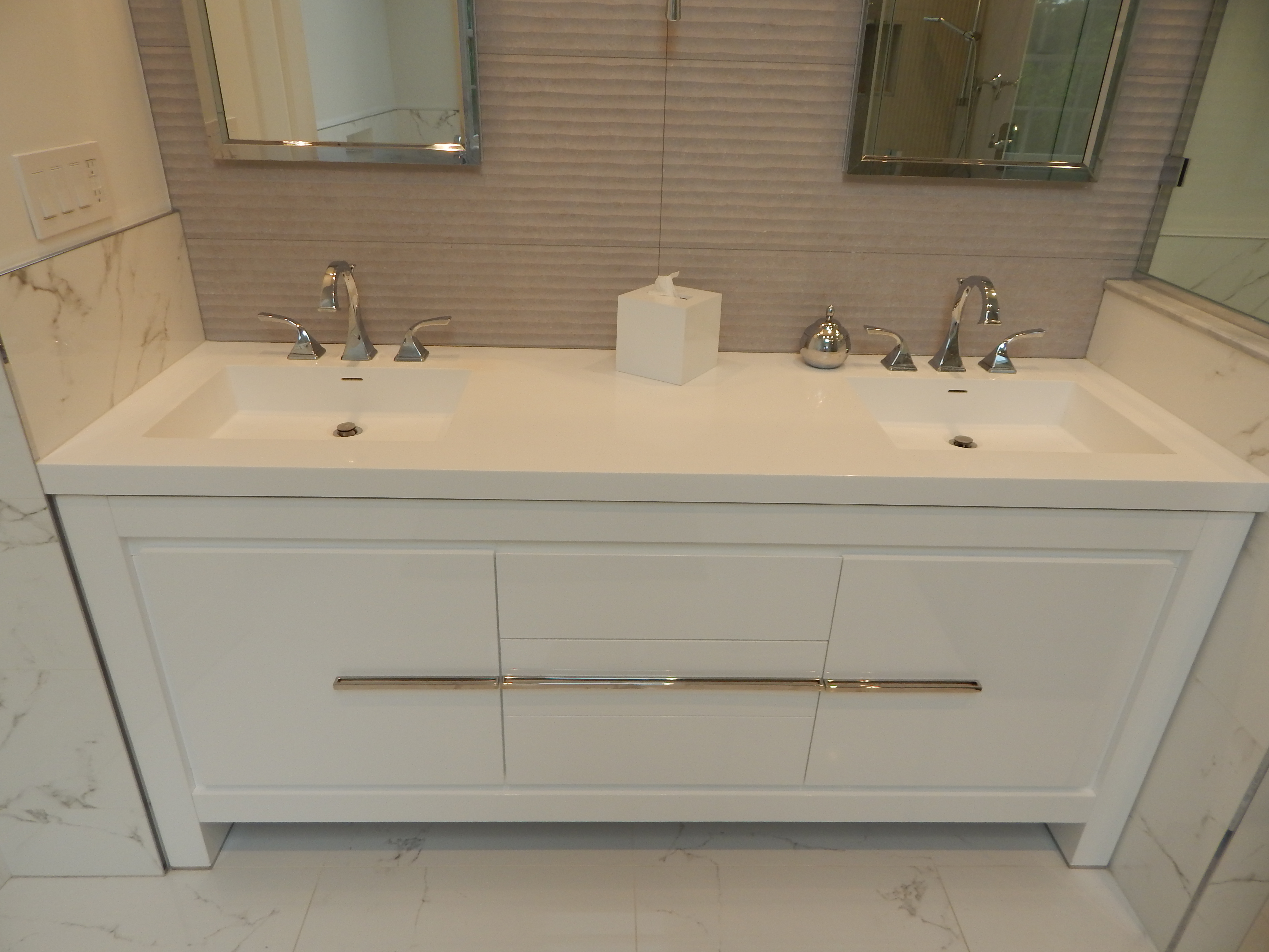 The minimalism of the glossy white Madeli double vanity with integral sink basins emphasizes the contemporary style the homeowners were looking for.