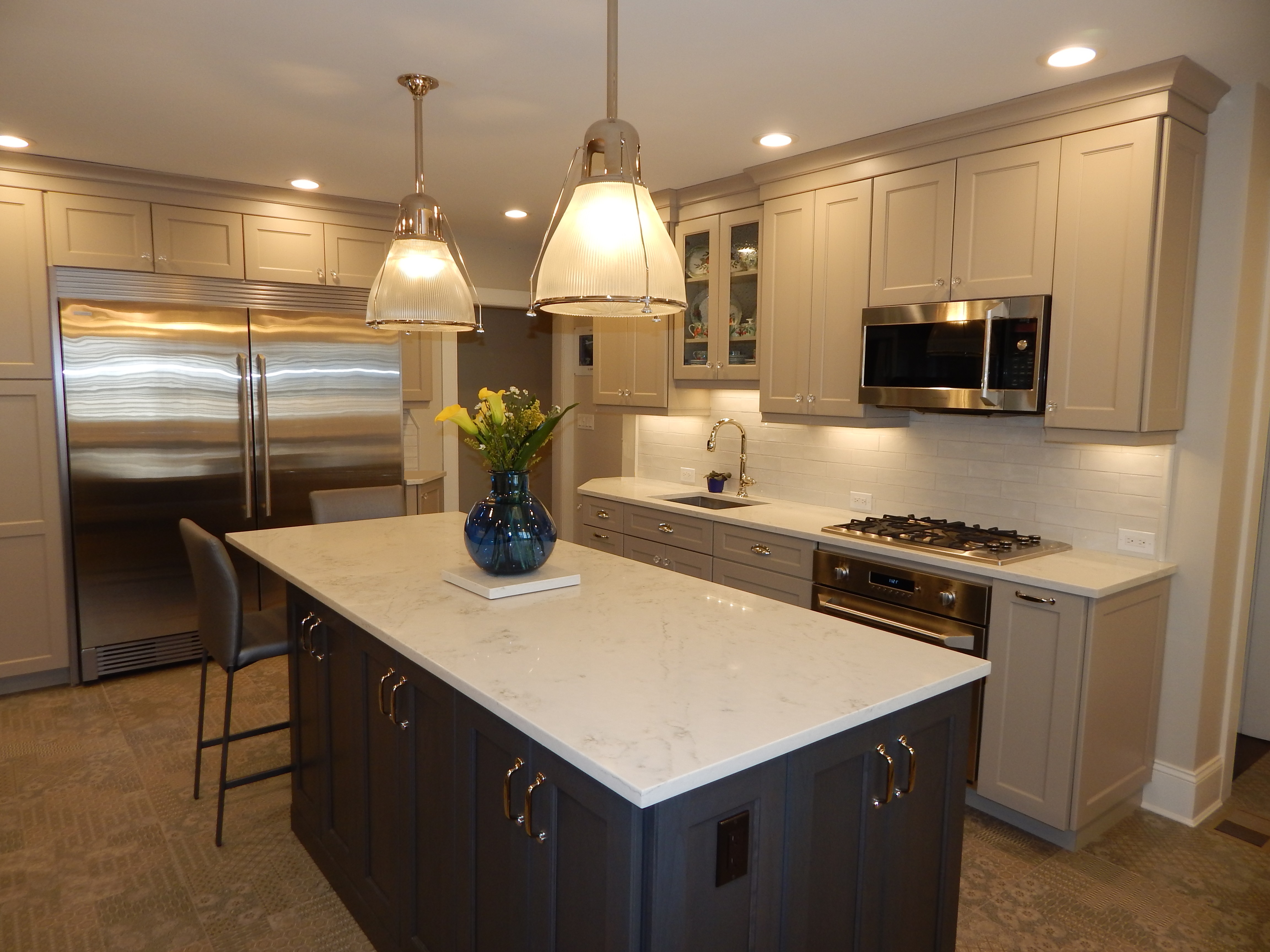 What was once a mismatched space of beige and white is now a blend of cohesive colors. The neutral tone of Portobello gray Omega Cabinetry along with the white countertops and white subway tiles allow the Smokey Hill island to really pop (also from Omega). Traditional Newport Brass faucets are an elegant touch paired with a Kohler farmhouse sink, which is simply a must in a kitchen of this magnitude. Stainless steel appliances, a huge refrigerator, and unique flooring make this dream kitchen a true work of art.