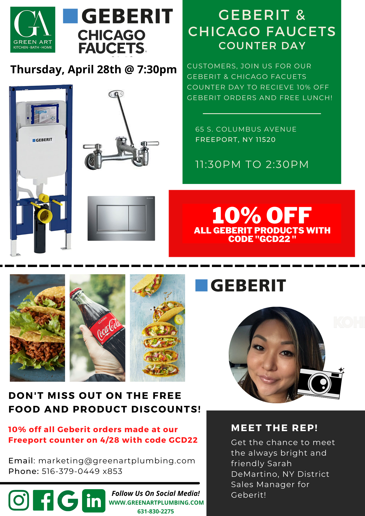 Customers, join us 4/28 for our Geberit & Chicago Facuets Counter day at our Freeport location to recieve 10% off all Geberit orders placed that day. Be sure to mention code “GCD22” to recieve your discount. Additionally, be sure to stop by between the hours of 11:30 am and 2:00 pm to recieve a free lunch on Green Art!